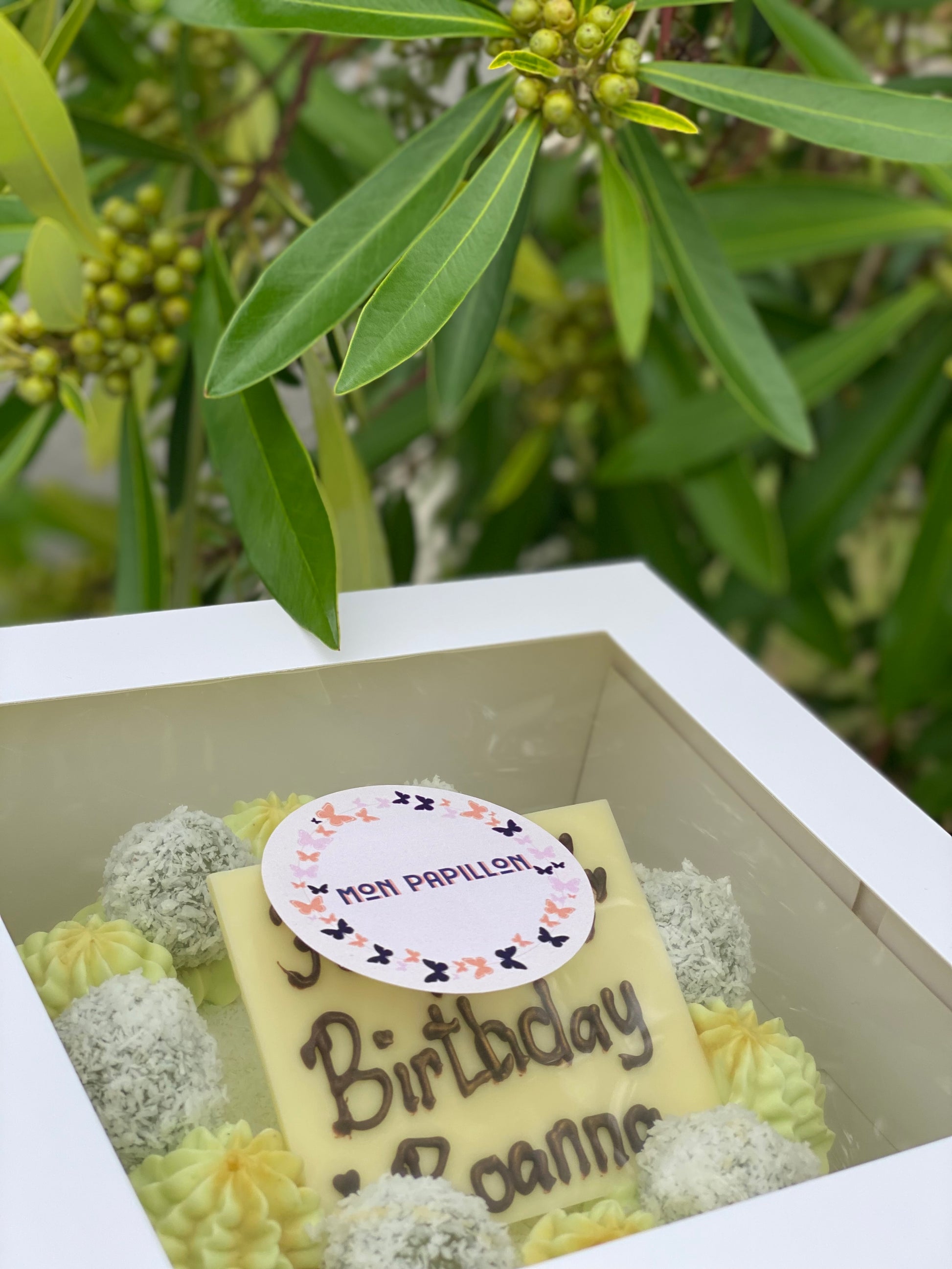 Chocolate plaque shape may vary. Number of words limit applies. Typically max 4 words would be great fit such as Happy 10th Birthday Steven, Happy Wedding Anniversary, etc. Image is for illustration purposes only.